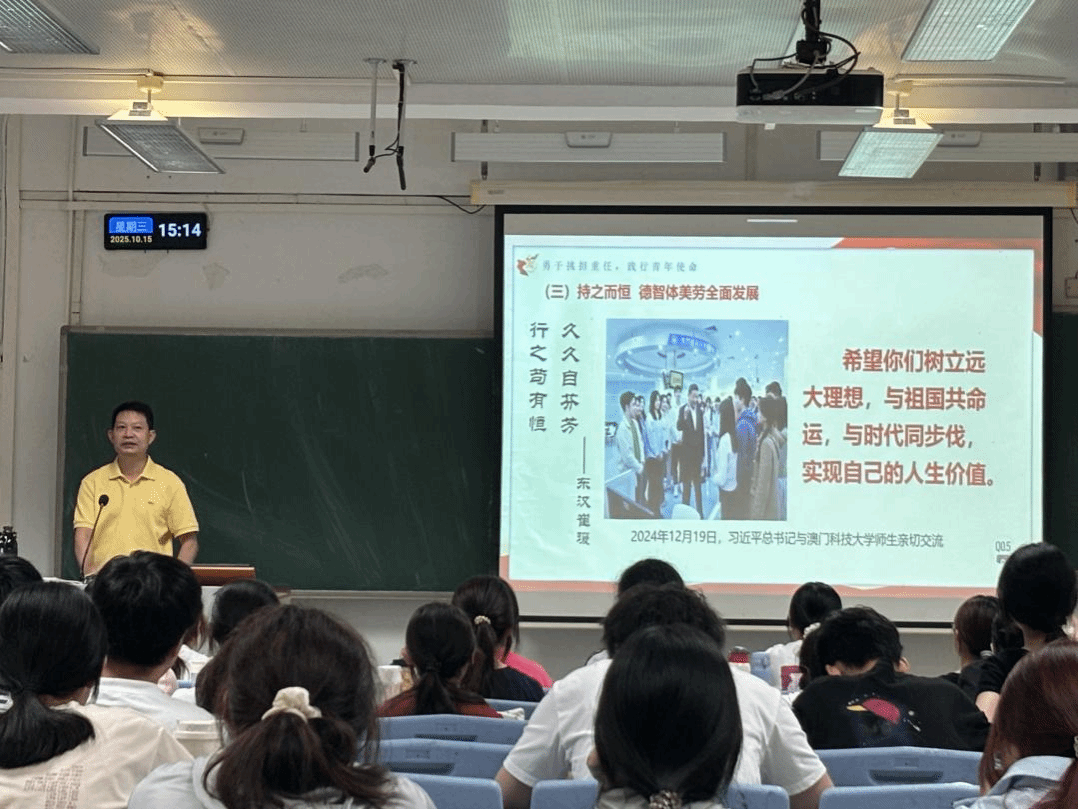 2025年10月15日,学院党委书记张伟林在 6F-205 教室,为2025级汉语言文学1班、2班及汉语言文学(师范)1班全体同学,讲授主题为 “认清当今形势,勇挑使命担当” 的 “思政第一课”,引导青年学子坚定理想信念,明确时代使命。