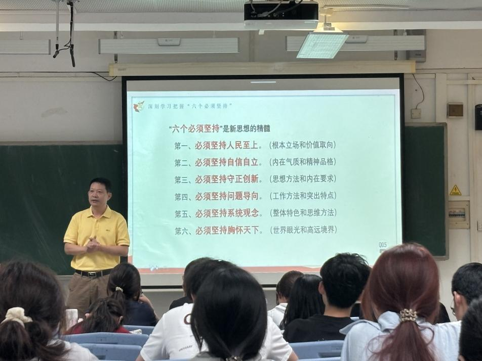 课堂上,张伟林书记结合习近平总书记在中国人民抗日战争暨世界反法西斯战争胜利80周年纪念活动上的重要讲话精神,深入剖析当前国际国内形势。他指出,世界正处于百年未有之大变局,国际环境复杂多变,我国虽在经济发展上取得不凡成就,但仍面临区域发展不平衡、改革需持续深化、综合国力有待提升等挑战。他强调,新时代青年需准确把握形势,深刻学习领会 “六个必须坚持” 的核心要义,将其融入思想、化为行动,筑牢成长根基。