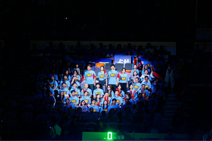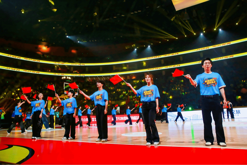 当晚,东莞篮球中心座无虚席,赛事氛围热烈高涨。《歌唱祖国》音乐快闪彻底点燃现场气氛,1名小女孩与4名大学生在观众席深情咏唱,由大湾区大学、香港城市大学(东莞)、东莞理工学院、东莞职业技术学院选派的共40名大学生齐聚舞台中央,全场大合唱,嘹亮的歌声响彻东莞篮球中心,炽热的爱国情怀充盈整个赛场。利颖希与杨稳强身着统一服装,以饱满的精神状态投入表演。台下观众纷纷驻足聆听,不少球迷随声合唱,爱国情怀与赛场热血在这一刻充分迸发,成为赛事中极具感染力的亮点环节。