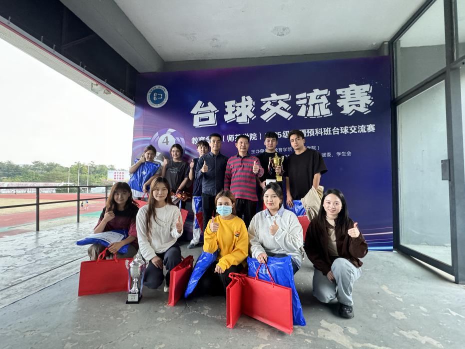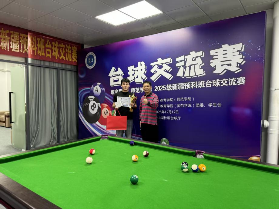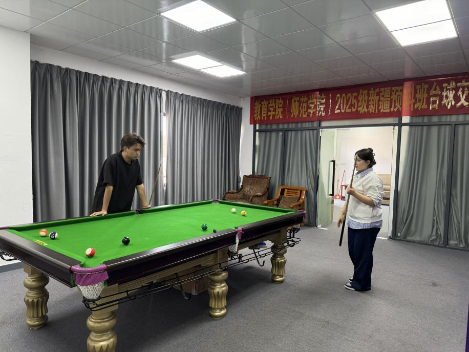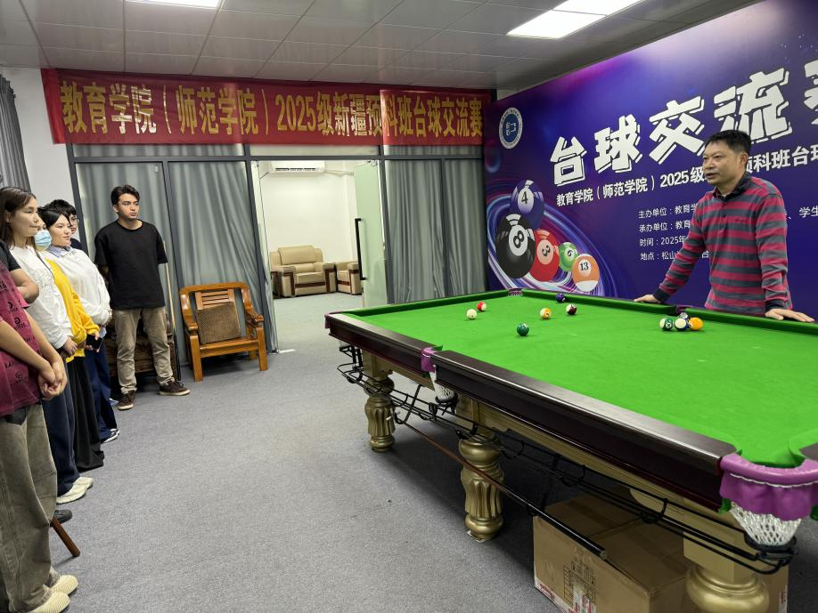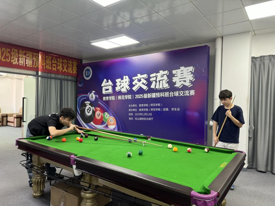 2025年12月12日,教育学院(师范学院)2025级新疆预科班台球交流赛在东莞理工学院松山湖校区台球厅顺利举办。活动当日,教育学院(师范学院)党委书记张伟林、学生工作办公室主任谢真葵参加本次活动。通过举办特色文体活动,校园文化更多元包容,增强学生的归属感和认同感,助力他们更好融入大学集体生活。此举是教育学院(师范学院)深化“三全育人”、促进民族团结、创新学生工作的具体实践。