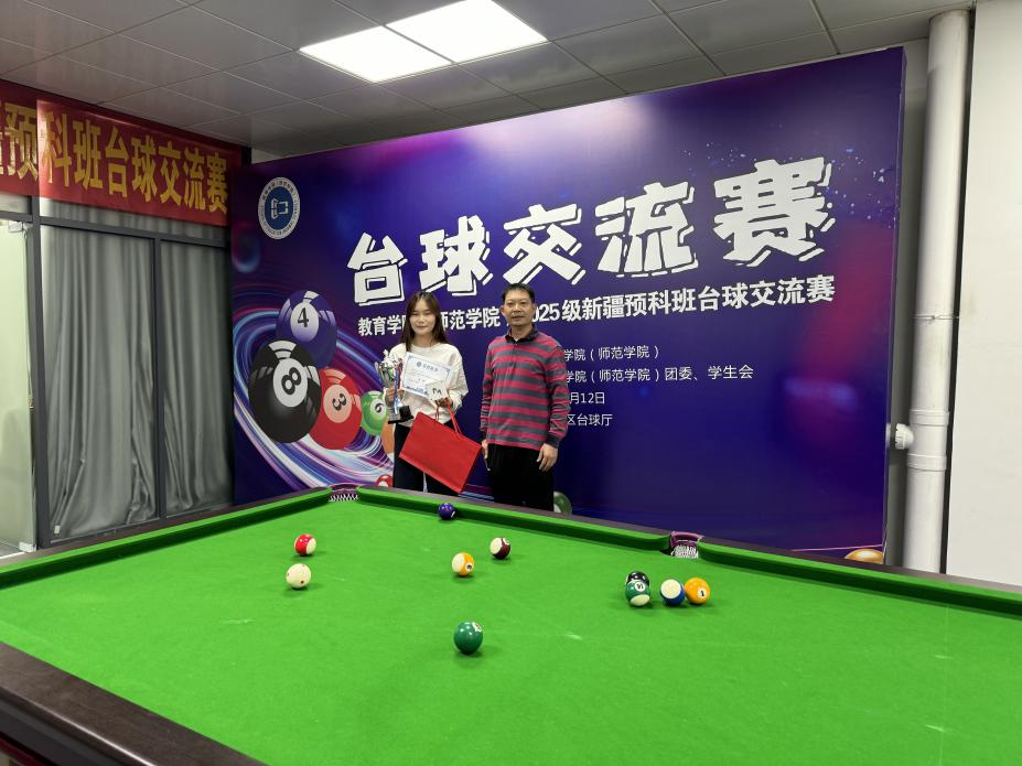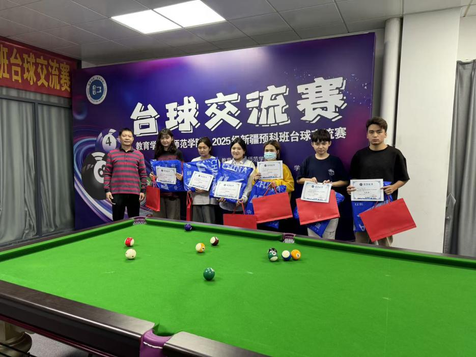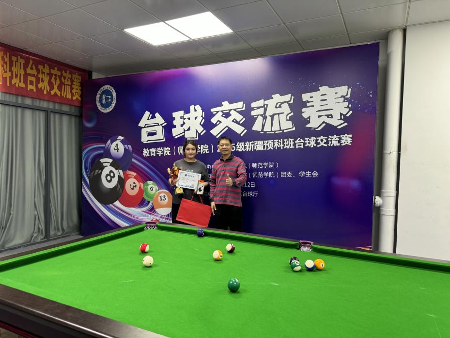 经过多轮激烈角逐,最终决出了冠、亚、季军以及优秀奖。约提库尔·艾力凭借精湛的球技和稳定的心态,一路过关斩将,成功摘得桂冠;阿勒斯·尼木才仁和帕提麦•阿布都海比尔同学分别获得亚军和季军。颁奖仪式上,教育学院(师范学院)党委书记张伟林为获奖选手颁发了奖杯、奖品和荣誉证书,现场掌声不断,气氛热烈。