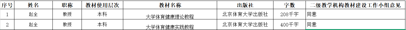 经教育学院(师范学院)教材建设工作小组审查, 《大学体育健康理论教程》、《大学体育健康实践教程》教材编写符合学校教材编写人员条件,拟同意其开展相关教材编写工作, 现予以公示,具体信息如下: